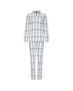 Fleece huispak van Pastunette bestaande uit een donkerblauw gestipt vest met kraag. Uni broek met rechte pijpen, het is gemaakt van een heerlijk zacht en warm fleece materiaal.